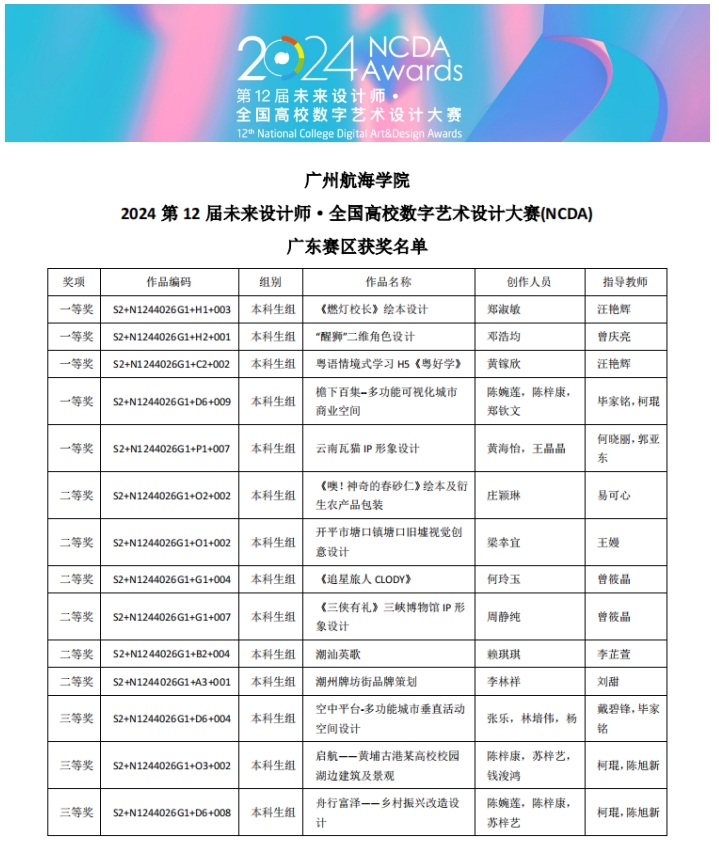 近日,第十二届未来设计师·全国高校数字艺术设计大赛(NCDA)获奖结果公布,我校数字媒体与交互设计学院师生共获得16项奖项,其中国家级一等奖1项、二等奖1项,省级一等奖5项、二等奖6项、三等奖3项。汪艳辉、曾庆亮老师荣获全国赛“优秀指导教师”称号;毕家铭、柯琨、何晓丽、郭亚东等老师荣获广东赛区“优秀指导教师”称号。