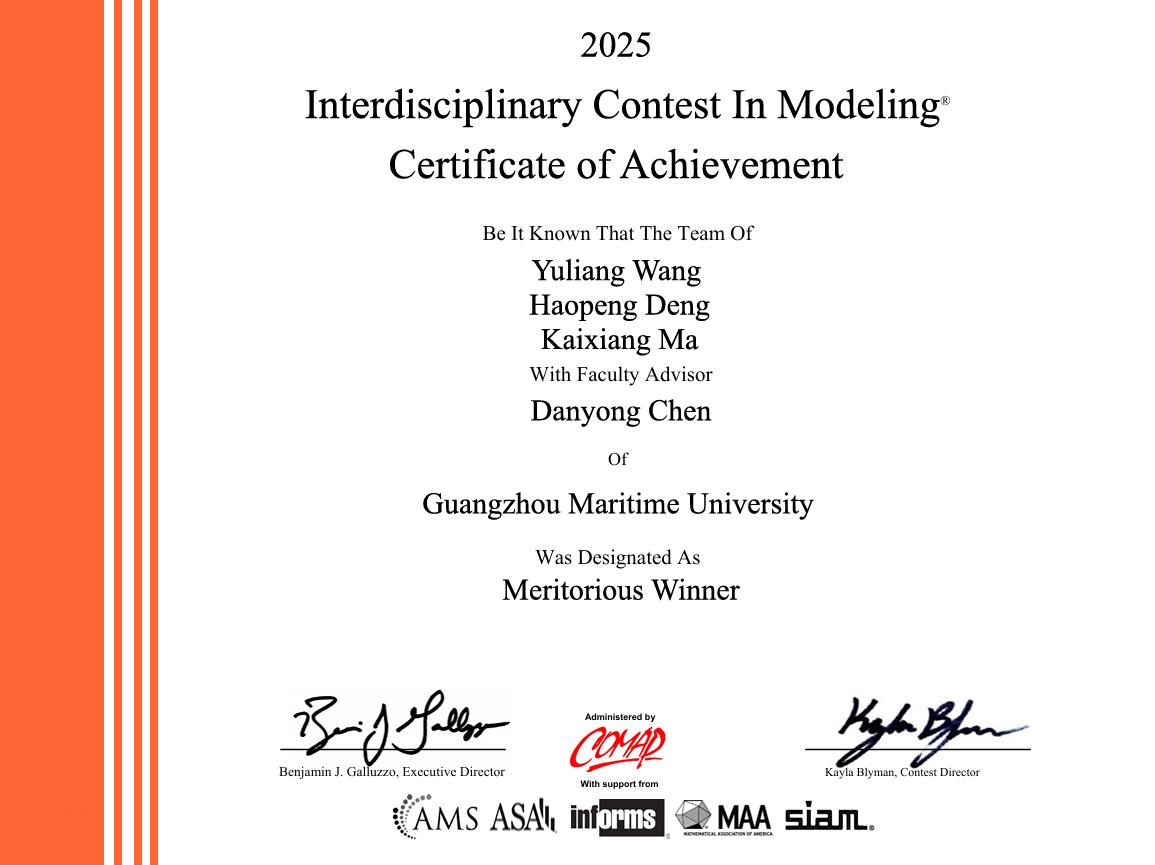 2025年MCM/ICM比赛于1月23日至27日举行,吸引了来自美国、中国、加拿大、英国等20多个国家和地区的27,456支队伍,逾8.2万名大学生参与,其中ICM竞赛共评出426个国际一等奖(Meritorious Winner),获奖率约6%。经过激烈的角逐,来自学校航运学院的王俞亮(海事管理专业)和智能交通与工程学院邓浩彭、马楷祥(工程管理专业)组成的学生团队获得一等奖,学校另一支由航运学院张丽(邮轮工程与管理专业)和智能交通与工程学院杜子轩(交通运输专业)、卫峥泳(土木工程专业)组成的团队获得成功参赛奖。