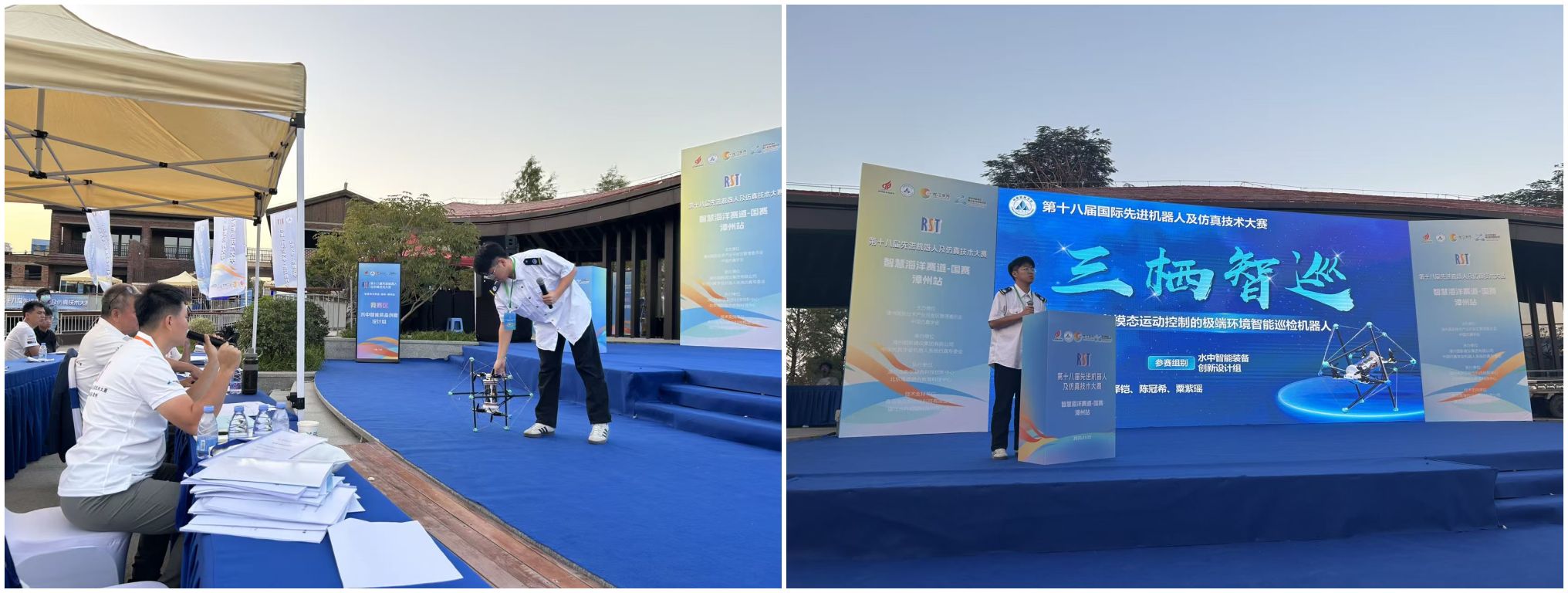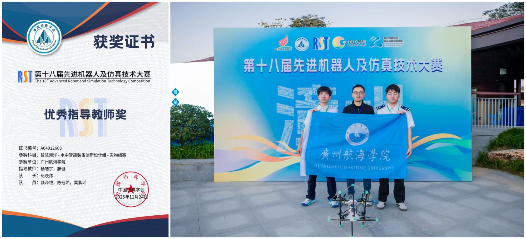 11月15日,由中国仿真学会、国际水中机器人联盟联合主办的“第十八届国际先进机器人及仿真技术大赛(RST)·智慧海洋赛道”全国总决赛在福建漳州圆满落幕。304am永利(中国)集团有限公司-Official Website张拉结构实验室团队凭借两项创新成果脱颖而出,一举斩获实物组全国一等奖(季军)、概念组全国二等奖,指导教师杨皓宇、滕健获评 “优秀指导教师奖”中央电视台 CCTV-4中文国际频道《中国新闻》对赛事进行全程跟踪报道,对广航院“三栖智巡”机器人样机特写播出,称赞该技术创新与工程应用价值。